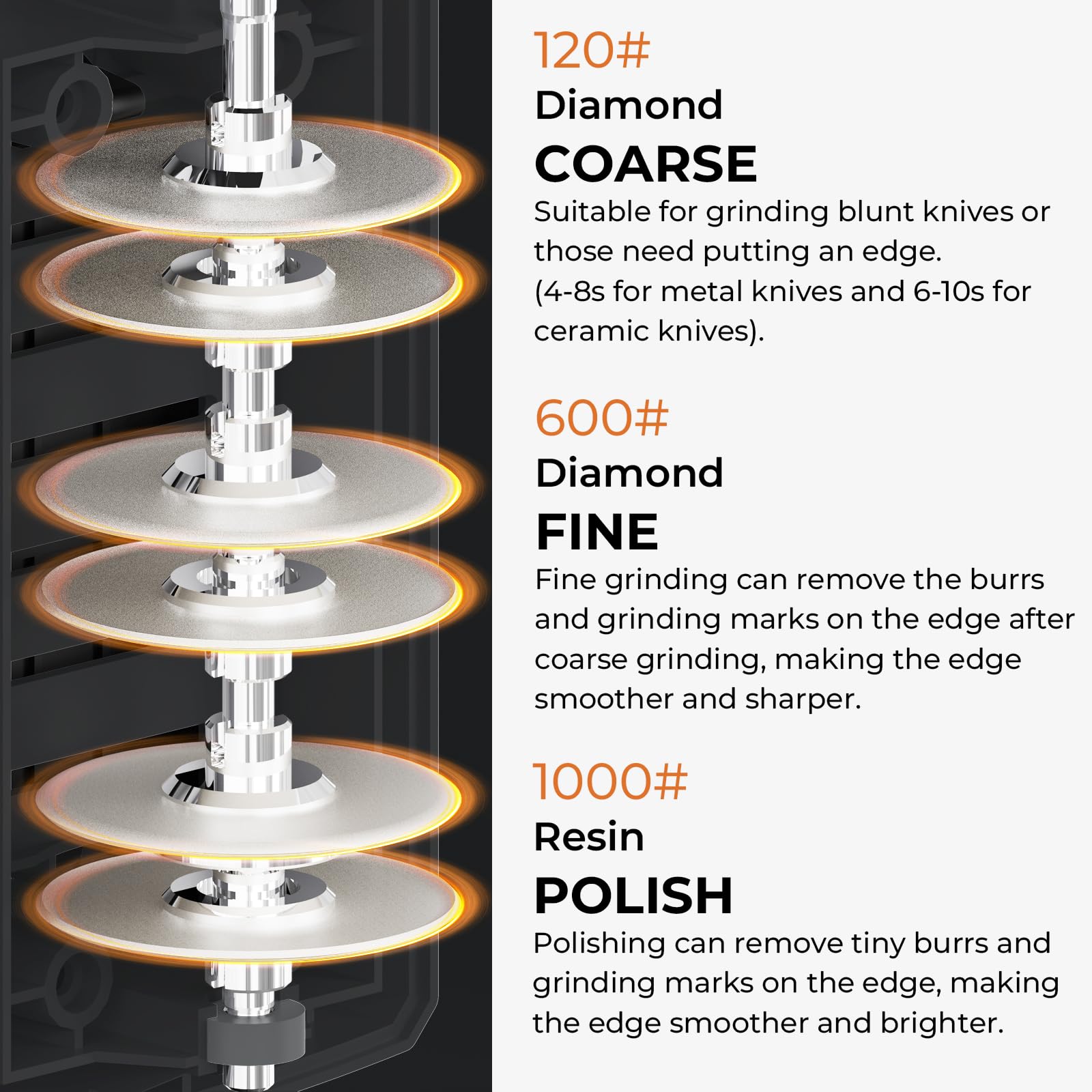 Använd steg 1 (120# diamant) för grovslipning av kraftigt slöa eller skadade knivar, steg 2 (600# diamant) för finslipning och borttagning av kanter, och steg 3 (1000# harts/polering) för att applicera en spegelblank finish som minskar friktionen och förlänger eggens hållbarhet.
